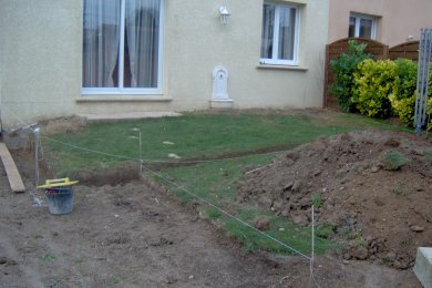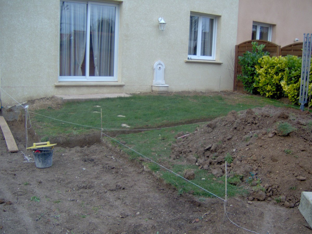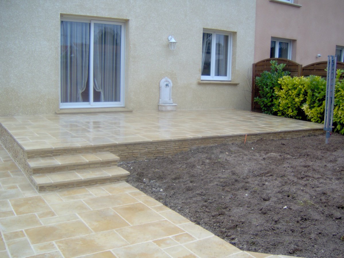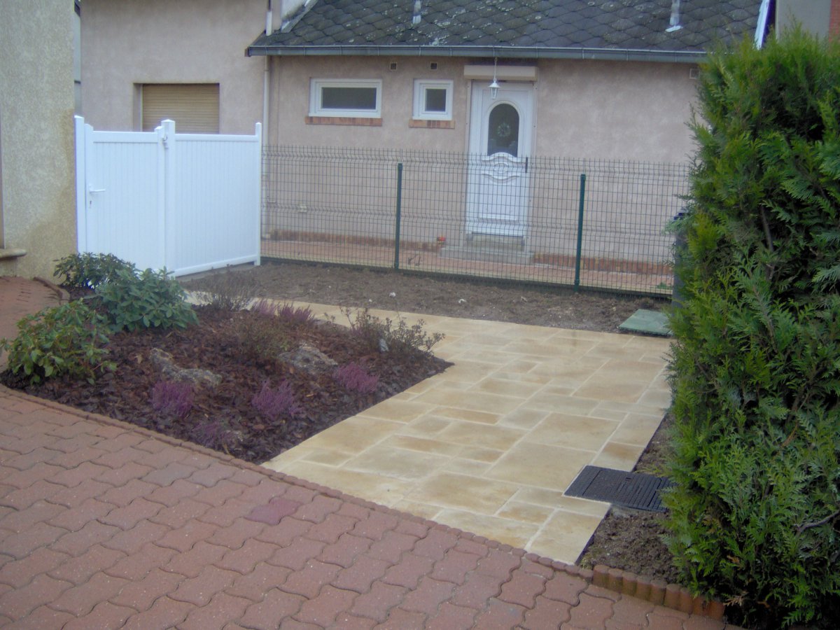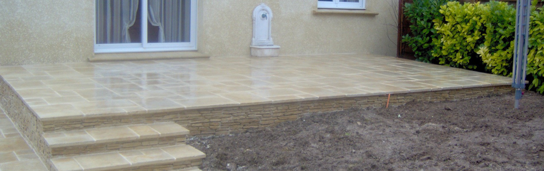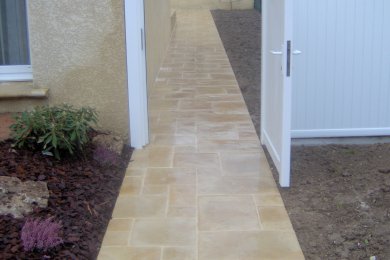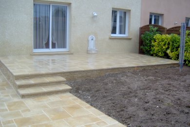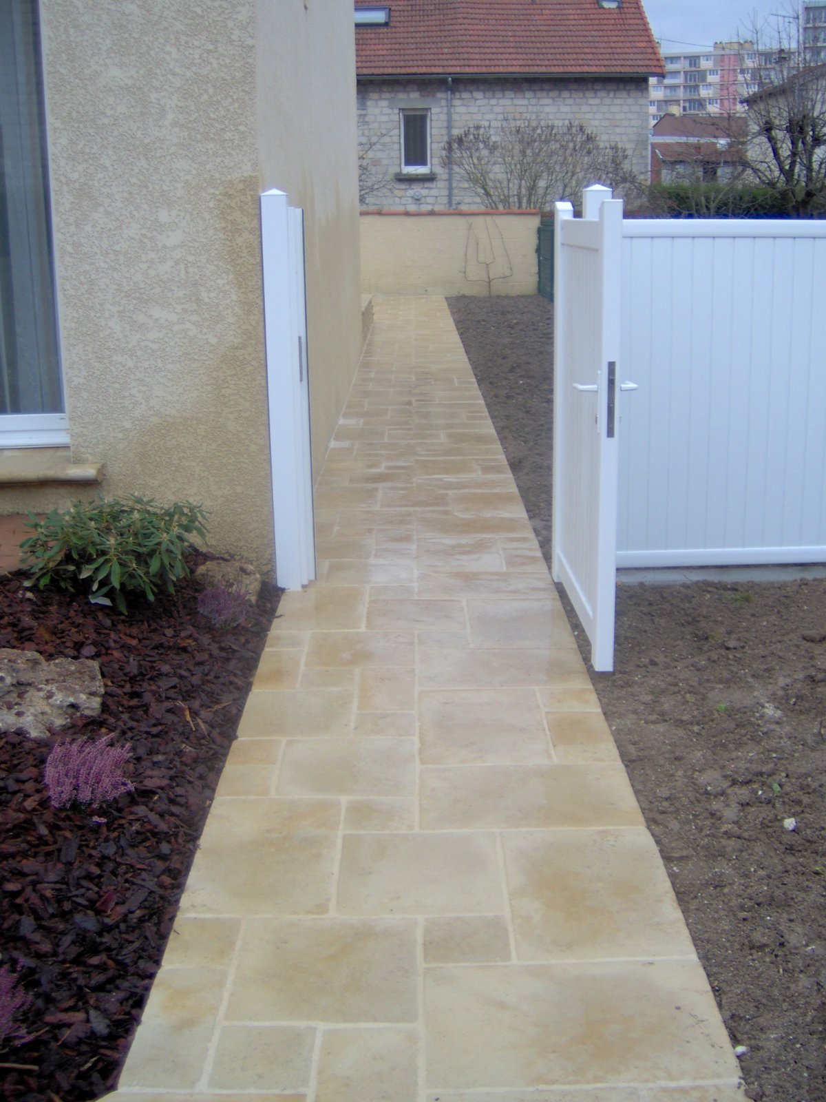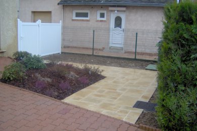 Réalisatioln d'un dallage avec allée, terrasse, escalier puis clôture et portillon en aluminium
