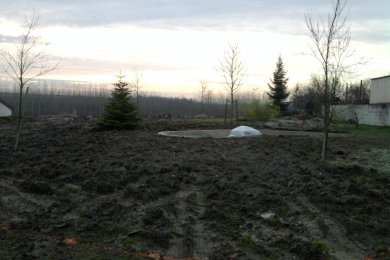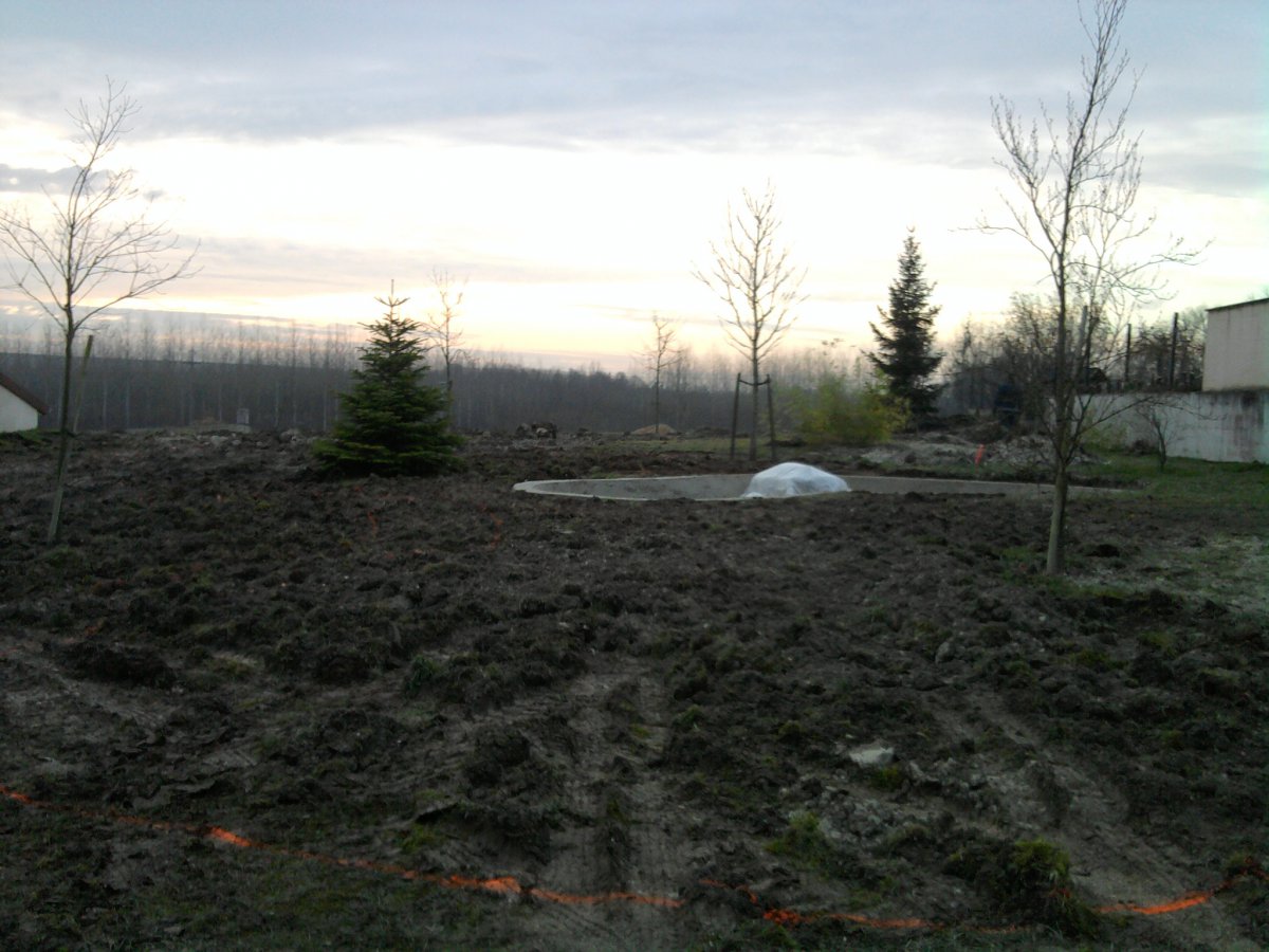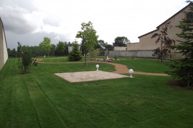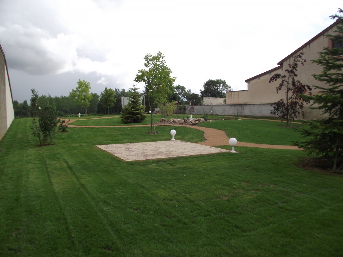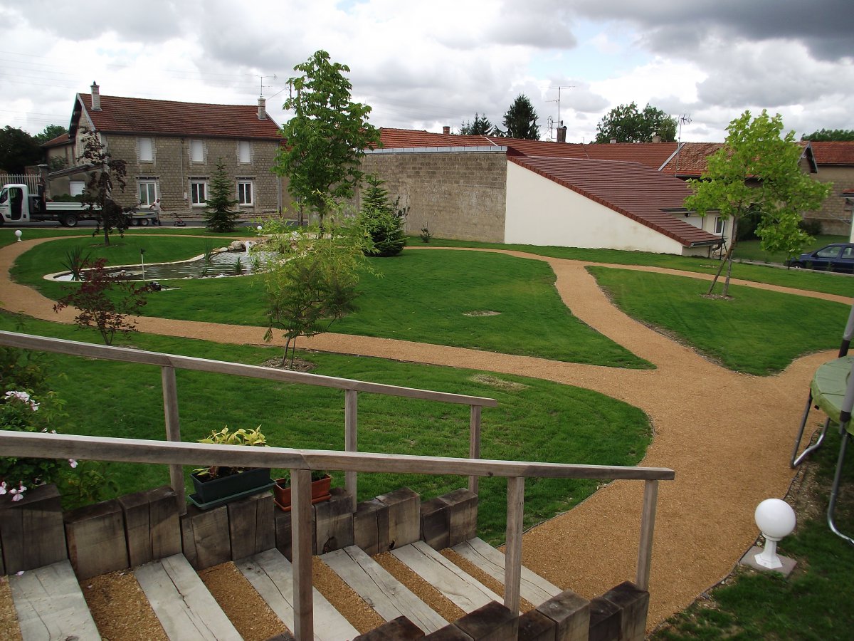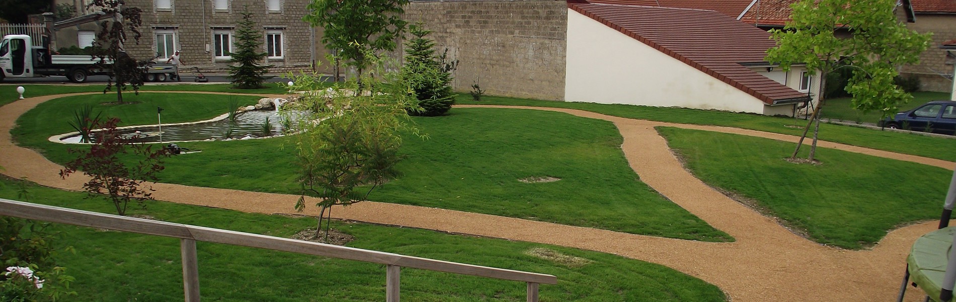 Réalisation d'un jardin avec bassin, allées, plantation, gazon, clôture, terrasse, un escalier en bois, etc